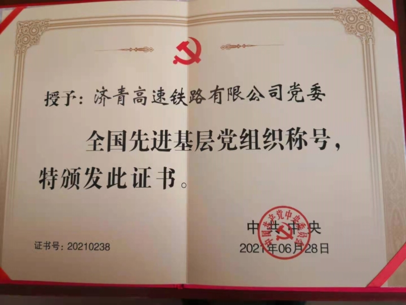 6月28日,全國(guó)“兩優(yōu)一先”表彰大會(huì)在北京人民大會(huì)堂舉行。濟(jì)青高速鐵路有限公司黨委被評(píng)為全國(guó)先進(jìn)基層黨組織,這是今年山東省國(guó)資系統(tǒng)唯一一個(gè)獲此殊榮的基層黨組織。山東鐵投集團(tuán)黨委委員、副總經(jīng)理,濟(jì)青高鐵公司黨委書記、董事長(zhǎng)楊俊泉參加了表彰大會(huì)并領(lǐng)取了證書和獎(jiǎng)牌。