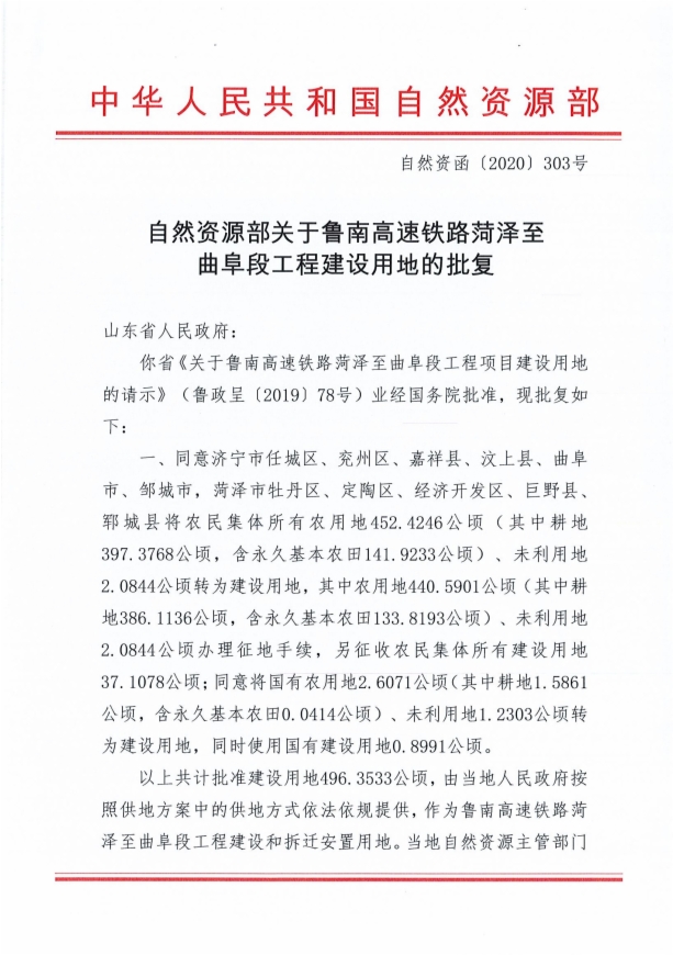 附:《自然資源部關(guān)于魯南高速鐵路菏澤至曲阜段工程建設(shè)用地的批復(fù)》(自然資函〔2020〕303號)