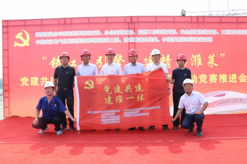 為慶祝中國共產(chǎn)黨成立99周年,掀起濰萊高鐵四電施工大干熱潮,7月2日,濟(jì)青高鐵公司辦公室黨支部、黨群工作部黨支部、工程管理部黨支部、安全質(zhì)量部黨支部、現(xiàn)場指揮部黨支部,聯(lián)合中鐵武漢電氣化局濰萊項目部黨工委、濟(jì)南維管處黨委、青島維管段黨工委、中鐵濟(jì)南監(jiān)理濰萊黨支部,開展“鑄紅色引擎,建精品濰萊”黨建共建暨“百日大干”勞動競賽推進(jìn)活動,形成合力打造高鐵工程“建維一體”化。