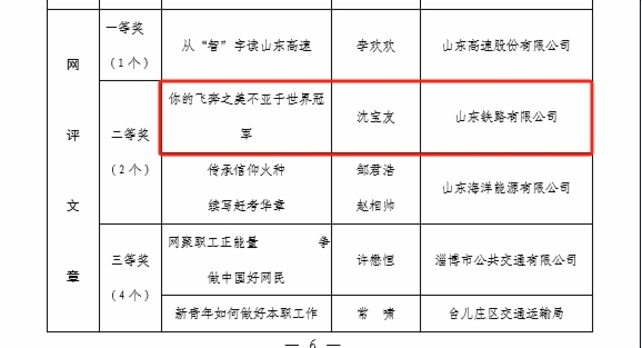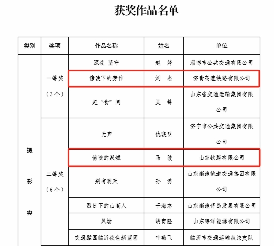 在“網(wǎng)聚職工正能量 爭做中國好網(wǎng)民”新媒體原創(chuàng)作品評選中,濟青公司劉杰同志《傍晚下的勞作》榮獲攝影類一等獎;鐵路公司馬駿同志《傍晚的泉城》榮獲攝影類二等獎;濟青公司宋磊同志《萊榮高鐵鋪軌》榮獲攝影類三等獎;魯南公司集體創(chuàng)作《永遠跟黨走》榮獲歌曲類二等獎;魯南公司董星辰同志《我是第一書記》榮獲微視頻類三等獎;基金公司集體創(chuàng)作《破圈》榮獲誦讀類二等獎;鐵路公司沈?qū)氂淹尽赌愕娘w奔之美不亞于世界冠軍》榮獲網(wǎng)評文章類二等獎。