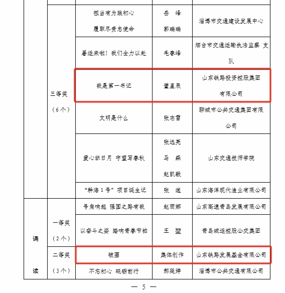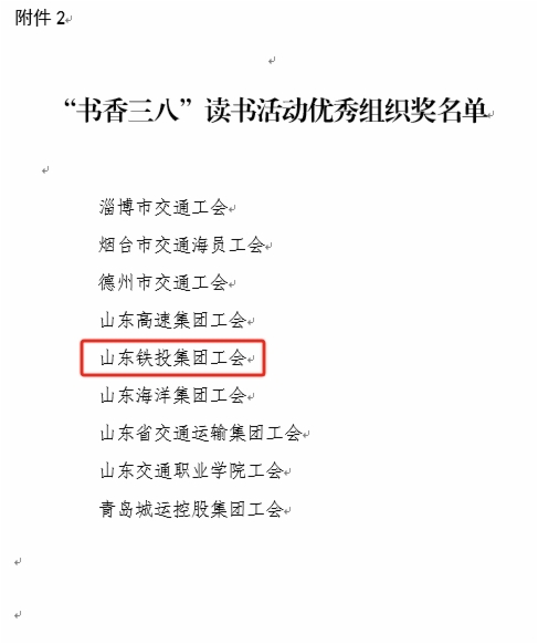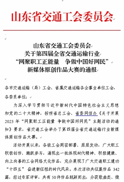 近日,由山東省交通工會舉辦的“網(wǎng)聚職工正能量 爭做中國好網(wǎng)民”新媒體原創(chuàng)作品大賽和“書香三八”讀書活動評選結(jié)果揭曉。集團工會選送的11個作品獲獎,集團工會榮獲兩個活動優(yōu)秀組織獎,受到省交通工會通報表揚。